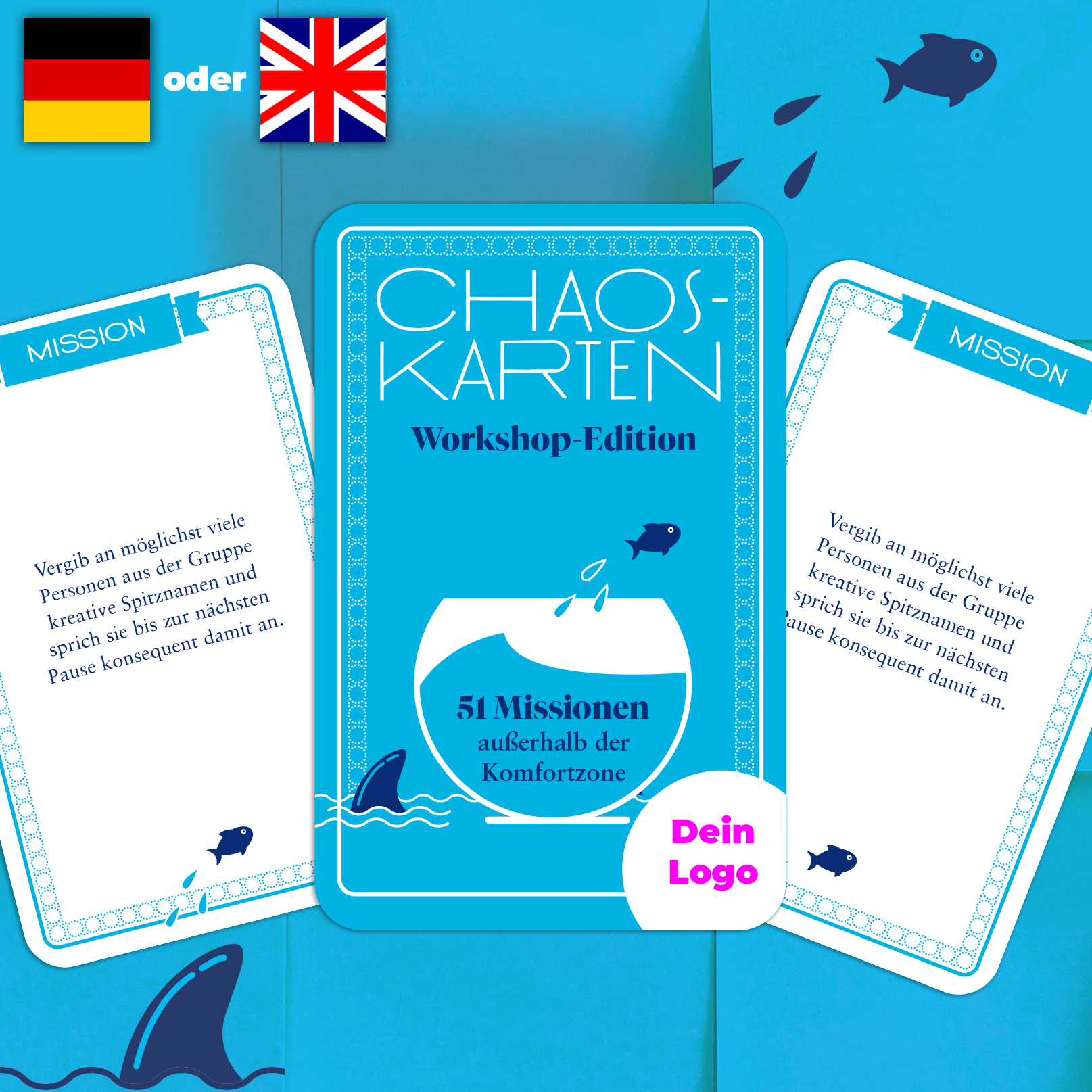 Die Chaoskarten Workshop-Edition besteht aus 51 Aufgabenkarten + 4 Karten (59 x 91mm) zum selbst ausfüllen, verpackt in einer wunderbar agilen Klarsichthülle.